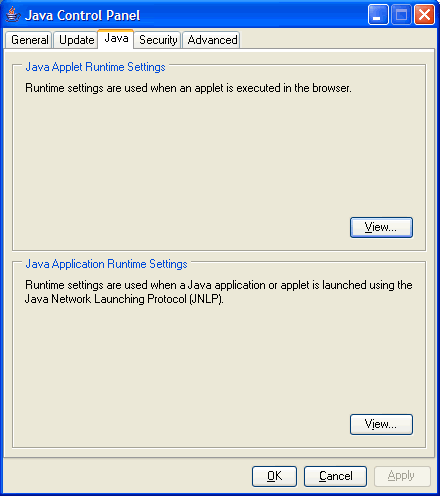 These settings will be used when an applet is launched in a browser. Press View... for the Java Runtime Settings for applets. On Windows you will see this: