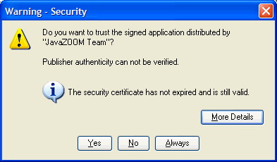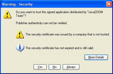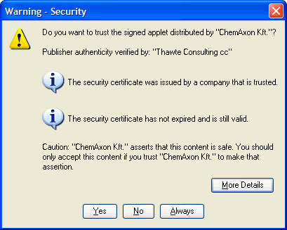 If the above two properties allow it, and the code is signed with certificate chains that can be properly validated, the user will then be shown a security dialog asking him/her to grant trust to the code.