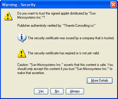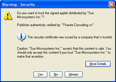 If the user answers "No", if the certificate is invalid, or if the user cannot be shown the dialog, either because deployment.security.askgrantdialog.show or deployment.security.askgrantdialog.notinca is false, then in Java Web Start the application will not be run, and in Java Plug-in the JAR will be run with sandbox permissions.